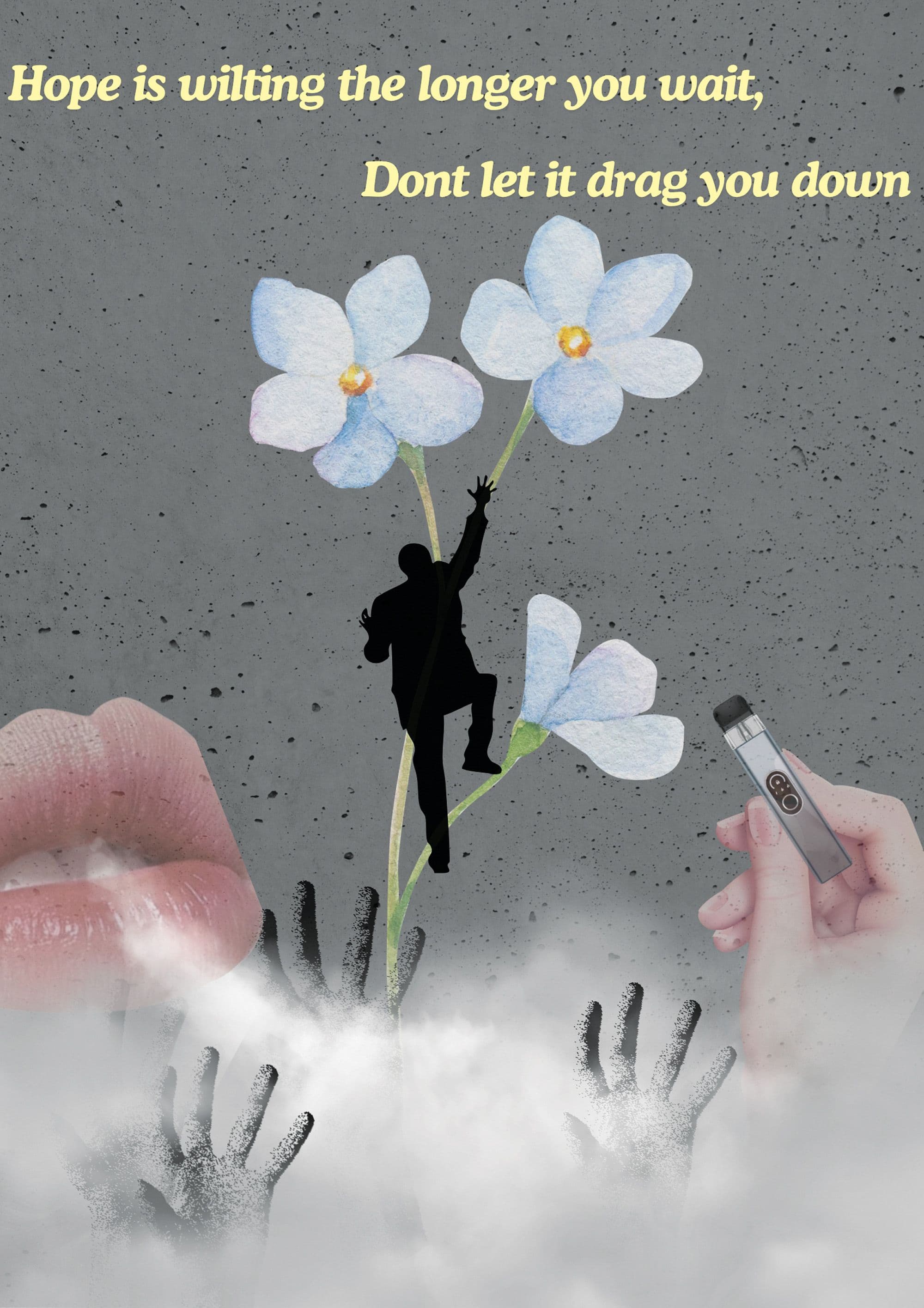 The flower symbolises that each individual, whether always using a vape or not, has the hope of escaping the hands of addiction that slowly strangle out ones life.